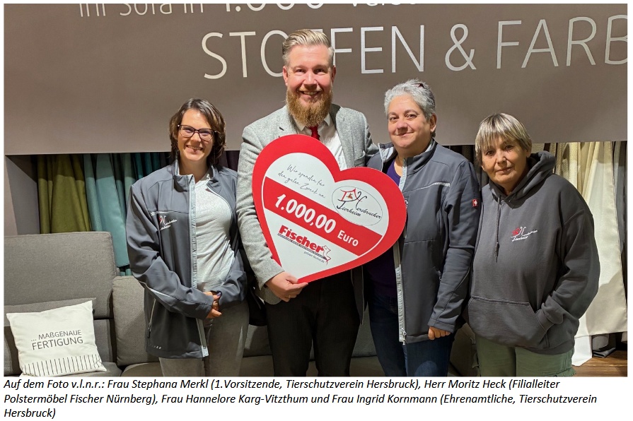 Die Übergabe des Spendenschecks fand am 19. November 2025 in der Nürnberger Filiale von Polstermöbel Fischer statt. Filialleiter Moritz Heck übergab den Scheck an Stephana Merkl (1.Vorsitzende), Ingrid Kornmann (Ehrenamtliche) und Hannelore Karg-Vitzthum (Ehrenamtliche) des Hersbrucker Tierheims. Für die Tombola, die am 7. Dezember 2025 am